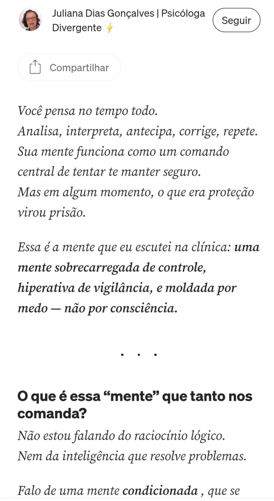 "Mas não basta olhar o outro: precisamos olhar para nós mesmos com coragem. E é isso que me mantém em movimento, me atravessando e me provocando constantemente.”“Por isso escolhi a Aliança Divergente ⚡um espaço que faz parte da minha própria jornada de expansão e autoconhecimento. É lá que experimento na prática aquilo que compartilho com meus clientes.” Se você quer saber mais, clique no link 👇
